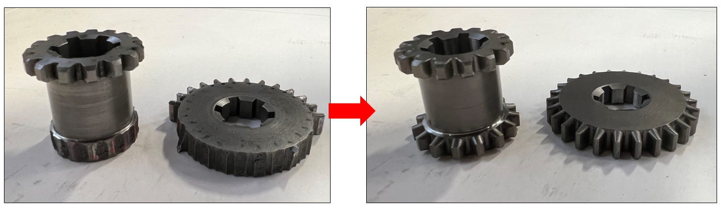 写真にありますように歯車対が損傷しており、左側歯車は半周ほど、右側歯車は全周「歯」がない状態でした。欠落していない「歯」と軸間距離を頼りに、歯車諸元の解析、簡単な図面作製するところから作業が始まります。